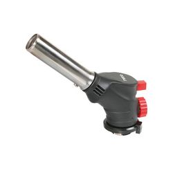 Multiuso para bricolaje y cocina. Encendido piezoeléctrico. Llama envolvente con regulador. Se puede usar en cualquier posición. Conexión a cartuchos desechables butano/propano. Soplete Ø quemador 22 mm.