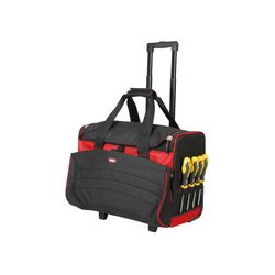 46x35x38 cm. Mango telescópico altura 100 cm. Ruedas reforzadas gran tamaño. Fondo rígido. Compartimiento exterior regulable 3 bolsillos. 16 alojamientos laterales portaherramientas. 4 bolsillos internos. 6 alojamientos internos. Apertura 2 cremalleras: fácil y rápido acceso al interior. Asas reforzadas. Carga máxima 30 kg.