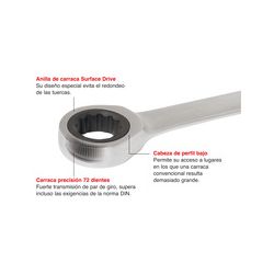 Profesional. 72 dientes. Acero cromo-vanadio acabado satinado. Solo 5º de movimiento son necesarios par su recuperación (6º en las de 6 a 9 mm). Anilla de carraca Surface Drive. Cabeza de perfil bajo. Carraca precisión 72 dientes. Mínimo ángulo de recuperaciòn. 20 mm.