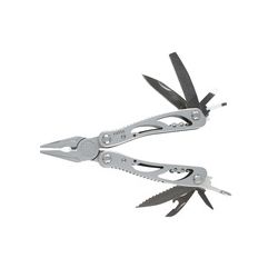 Cuerpo de acero inox 420. Incluye funda de nylon adaptable a cinturón. 10 funciones. Medida abierto: 160 mm y cerrado: 105 mm. Alicate universal, Cortador de alambre, Cuchillo dentado de 5 cm, Abrelatas/abrebotellas, Minicuhillo, Destornillador Phillips, Destornillador plano 3 - 4 mm, Lima doble cara 5 cm. navaja punta 5 cm.