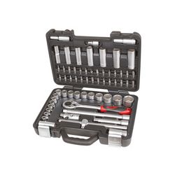 Acero cromo-vanadio satinado. Vasos 1/2 con sistema de bloqueo Locksystem. Composición: 17 Vasos 1/2: 10-32 mm. 9 Vasos serie larga 1/2: 10-22 mm. 1 Llave carraca 45T x 1/2. 2 Prolongadores 1/2 x 125 - 250mm. 2 Llaves bujía 1/2 x 16 - 21 mm. 1 Cardán universal 1/2. 1 Mango deslizante T 1/2 x 245 mm. 1 Adaptador puntas 1/2 a 10 mm. 28 Puntas atornillador 30x10 mm.: Torx: 20-25-27-30-40-45-47-50. Allen: 4-5-6-7-8-10 mm. PH: 1-2-3-4. PZ: 1-2-3-4. Plana: 4-5,5-6-7-8-10 mm.