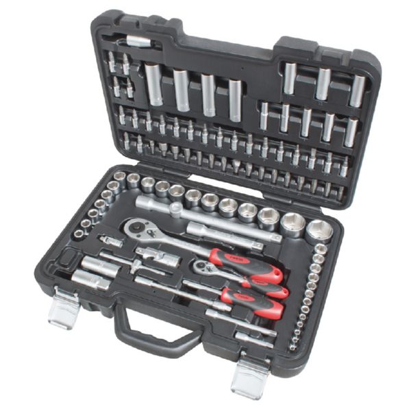 Acero cromo vanadio satinado. Vasos 1/4 y 1/2 con sistema de bloqueo Locksystem. Composición: 18 Vasos 1/2 10-32mm. 13 Vasos 1/4 4-14 mm. 4 Vasos serie larga 1/2 14-15-17-19 mm. 8 Vasos serie larga 1/4 6-13 mm. 22 Vasos 1/4 con punta PH: 2xnº 1-2xnº 2 Plana: 4-5.5-7 mm Allen: 3-4-5-6 mm. PZ: 2xnº 1-2xnº 2 Torx: 8-10-15-20-25-27-30 3 Llaves allen: 1.5-2-2.5mm. 2 Prolongador 1/2 x 125-250 mm. 2 Llaves bujías 1/2 x 16-21 mm. 2 Prolongador 1/4 x 50-100 mm. 1 prolongador flexible 1/4x150 mm. 2 Llave carraca 1/4-1/2 (1/2 68T y 1/4 45T). 2 Cardán universal 1/4-1/2 2 Adaptador puntas 1/4 - 1/2 (para 8 mm). 1 Cabezal mango T 1/2 h x 3/8 m. 1 Mango deslizante T 1/4 1 Mango destornillador vasos 1/4 15 puntas atornillado 8x30 mm: PH: 3-4. Plana 8-10-12 mm. Allen: 8-10-12-14mm. PZ:3-4. Torx: 40-45-50-55