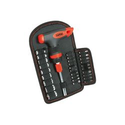 Carraca reversible. Soporte portaherramientas con clip para cinturón. Mango ergonómico antideslizante bimaterial. Vasos acero cromo-vanadio. Puntas acero S2. 19 puntas.Plana: 4-5-6 mm, Phillips: Nº0-1-2-3, Torx: T10-15-20-25 mm. Stecker hexágono: 3-4-5-6 mm., Pozidriv: PZ0-1-2-3, 9 vasos: 5-6-7-8-9-10-11-12-13 mm., 1 adaptador vasos, 1 portapuntas magnético 6 ,3x139 mm., 1 mango tipo T, 1 soporte portaherramientas.