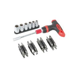 Telescópico 120-165 mm. Mango ergonómico antideslizante bimaterial con carraca reversible, vasos acero cromo-vanadio y puntas acero S2. 1 mango tipo T 1 portapuntas magnético 5x100 mm. 1 adaptador de vasos 31 puntas 6 vasos
