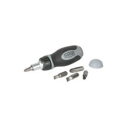 Carraca reversible. Mango antideslizante bimaterial con depósito para puntas. Puntas acero S2. Mango destornillador carraca 5 puntas. Boca recta: 5-6 mm. Boca Phillips: Nº1- 2-3