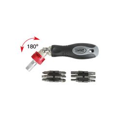 Mango ergonómico bimaterial antideslizante. Carraca reversible. Cabezal basculante 180º. 24 Puntas acero S2. Mango destornillador
