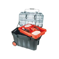 Construcción robusta en polipropileno moldeado. Cierre metálico central. Tapa superior con ranura forma V para serrar maderas o tubos. Bandeja interior extraíble con 2 compartimentos cerrados. Sistema de sujección de niveles bajo la tapa. Asa metálica telescópica con empuñadura de goma. Ruedas de goma Ø 152x51 mm. 75,5x47x48,5 cm.