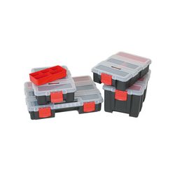 Juego 4 cajas modulares fabricadas en polipropileno. Bandejas interiores y compartimentos regulables. Composición: 2 cajas 15,6x23x6 cm. 1 caja 15,6x23x11,5 cm. 1 caja 29x23x6 cm.
