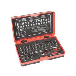 Mango destornillador carraca reversible. Puntas precisión en acero 8660. Estuche plástico. Composición: 1 Mango destornillador carraca. 1 Prolongador portapuntas 115 mm. 1 Prolongador portapuntas flexible 150 mm. 30 Puntas atornillador 4x28 mm: Phillips: 000-00-0-1 Pozidriv: 0-1 Planas: 1-1,5-2-2,5-3-3,5-4 mm. Allen: 0,7-0,9-1,3-1.5-2-2,5-3-4. Torx: 4-5-6-7-8-9-10-15-20. 6 Puntas con vasos: 2,5-3-3,5-4-4,5-5 mm.