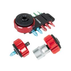 Carraca magnética reversible 1/4 con conexión hexagonal para puntas y conexión para vasos 1/4. Soporte plástico con 10 puntas 25 mm. acero S2 coloreado. Composición: 2,3,4,5,6 mm. PH 1-2-3 PZ1-2