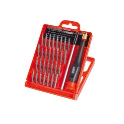 32 piezas. Acero cromo-molibdeno. Estuche plástico. 1 Mango ergónomico bimaterial antideslizante, cabezal giratorio 1 Prolongador 9 Puntas Torx: T4-T5-T6-T7-T8-T9-T10-T15-T20 7 Puntas Planas: 1,0-1,5-2,0-2,5-3,0-3,5-4,0 mm. 4 Puntas Phillips: Nº000-Nº00-Nº0-Nº1 2 Puntas Pozidriv: Nº0-Nº1 8 Puntas Allen: 0,7-0,9-1,3-1,5-2,0-2,5-3,0-4,0 mm.