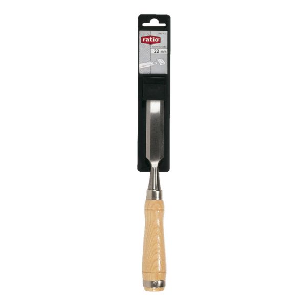 Acero cromo-vanadio. Biselado. Mango madera barnizado, virola metálica de refuerzo. Protector de filo integrado en el embalaje. 28 mm