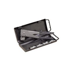 Cabezal 2 posiciones (horizontal y vertical) con tambor giratorio. Para remaches aluminio. Cuerpo chapa y empuñaduras de PVC. Estuche plástico con 100 remaches de aluminio surtidos. Remaches diam. 2,4 - 4,8 mm.