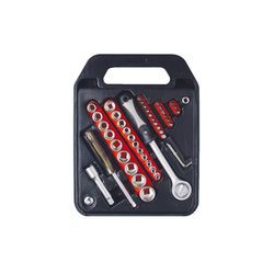 Acero cromo-vanadio. 47 piezas. Acabado satinado. 9 Vasos 3/8: 10 - 19 mm 11 Vasos 1/4: 4 - 13 mm 1 Adaptador 3 Llaves Allen : 1,5 - 2 - 2,5 1 Llave carraca reversible 1 Prolongador 1 Mango para vasos 1 Adaptador de puntas 19 Puntas hexagonales