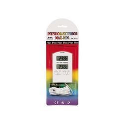 Interior. Doble plantalla de cuarzo y memoria de máximas y mínimas. Mide la temperatura y la humedad relativa interior. 103 x 65 mm.
