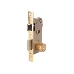 Golpe y llave estriada. Doble cilindro redondo desmontable. Reversible. Frente hierro latonado. Entrada 30 mm.
