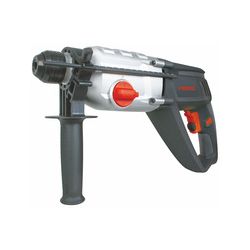 Anclaje SDS-Plus. Velocidad variable, tres funciones: taladro, taladro con percusión y cincelado con parada de giro, interruptor con bloqueo de seguridad. Empuñadura bimaterial. Maletín transporte con cierres metálicos, empuñadura auxiliar, tope profundidad, 3 brocas SDS-Plus, 2 cinceles SDS-Plus, 1 adaptador y portabrocas con llave. Recambio escobilla.