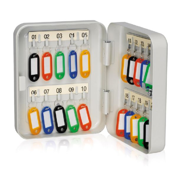 Acero pintado de color gris claro. Incluye llaveros portaetiquetas y colgadores numerados. 20 llaves. 155x60xh.200 mm.