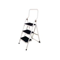 Tubo acero pintado epoxi blanco. Peldaños y pies angulares antideslizantes. Arco sobredimensionado. Bloqueo de seguridad. Escalera 3 peldaños.