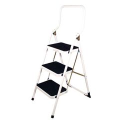 Tubo acero pintado epoxi blanco. Peldaños y pies angulares antideslizantes. Arco sobredimensionado. Bloqueo de seguridad. Escalera 4 peldaños.