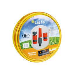 Conjunto conexiones: racor hembra, 2 conectores y lanza riego. Tricotada 3 capas. Atóxica. Antialgas. Presión de servicio 8 bares. Ø 15 mm x 15 m