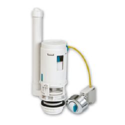 Tanque bajo. Mecanismo universal de doble pulsador con descarga regulable de agua. Ahorra más de 30.000 litros de agua al año. Adaptable a todo tipo de cisternas. Doble pulsador con transmisión vertical.