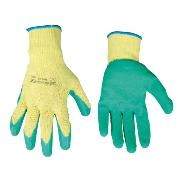 Grip algodón/poliéster. Sin costuras con recubrimiento rugoso de látex natural verde. Uso: Construcción, agrícolas, mantenimiento, servicios de limpieza. Cat. II. Talla 9