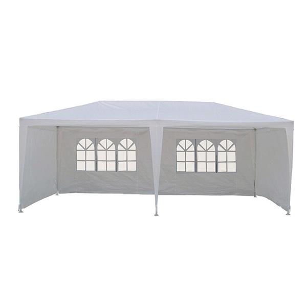 Estructura metálica. Toldo de rafia blanca. Cerramiento completo con cortinas laterales.