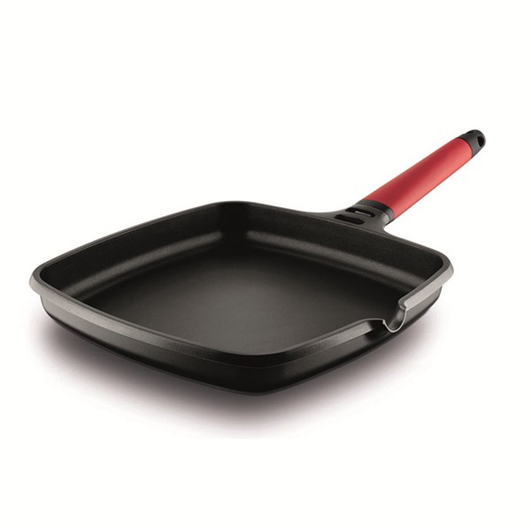 Aluminio fundido indeformable de gran espesor. Distribución homogénea del calor. Contacto perfecto con la superficie de la cocina. Recubrimiento antiadherente libre PFOA. Apto lavavajillas. Asas fijas de silicona termoaislantes para prevenir quemadur Asador plano. 22x22 cm.