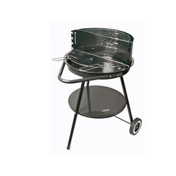 Cubeta acero lacado. Parrilla cromada altura regulable. Bandeja inferior Ø 46 cm. Ruedas transporte. Parrilla: Ø 46 cm. Parrilla auxiliar: 45x17 cm. Altura parrilla: 66 cm. Dimensiones: Ø 60xh.80 cm.