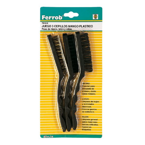 Juego 3 unidades mango plástico. Púas latón, hierro, nilón. 225 x 20 mm. 3 hileras.