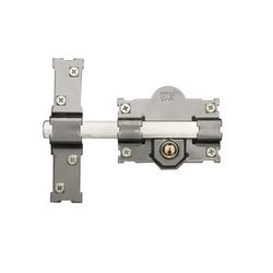 Accionado interior y exteriormente por llave quedando siempre la barra fija. Barra en acero calibrado 18 mm. Placa en acero 2 mm. Cerradero en acero 3 mm. Bombillo 50 mm. Niquelado