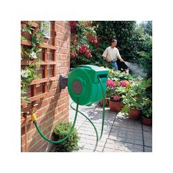Montaje mural, gira 180º sobre su eje. Permite ajustar la manguera a la longitud deseada y rebobinarla sin esfuerzo. Asa de transporte y cierre de seguridad. Incluye conectores, lanza de riego y manguera de alimentación. 20 m. manguera diam 12,5 mm