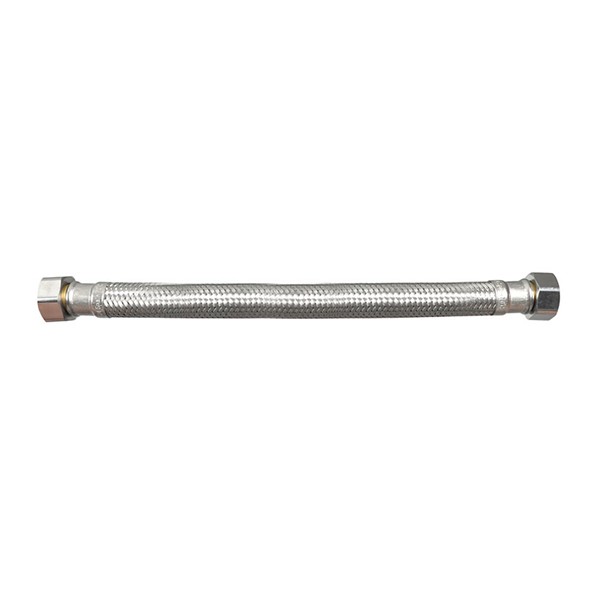 (Latiguillo). Tubo caucho sintético, trenzado con hilos de acero inox. Racor latón niquelado ø 13 mm. M-H. 1/2. 30 cm.