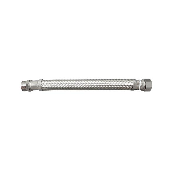 (Latiguillo). Tubo caucho sintético, trenzado con hilos de acero inoxidable. Racor latón niquelado ø 18 mm. M-H. 3/4. 50 cm.