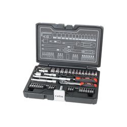 1/4. Acero cromo-vanadio, acabado satinado y pulido. Vasos perfil Superlock que evita el redondeo de las tuercas hexagonales. 1 llave carraca curvada Locksystem, 1 mango para vasos, 3 prolongadores: 50-100-150 mm., 1 cabeza deslizante T:3/8 x M1/4, 1 cardán universal, 4 llaves allen: 1,27-1,5-2-2,50 mm., 1 adaptador puntas, 20 puntas acero S2: Plana 4-5-6 mm., PH 1-2-3, PZ 1-2-3, Allen 3-4-5-6 mm., Torx 10-15-20-25-27-30-40, 13 vasos perfil Superlock: 4-4,5-5-5 ,5-6-7-8-9-10-11-12-13-14 mm.