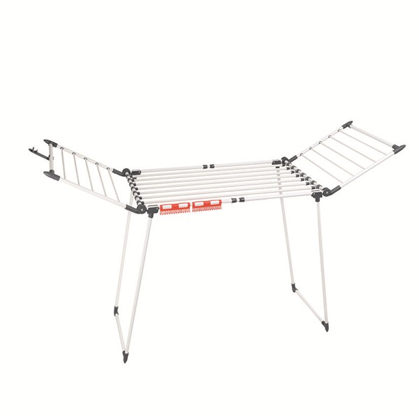 Acero pintado. Extensible. Capacidad máxima de tendido 27 metros. Incluye pieza para colgar calcetines y prendas pequeñas. Abierto: 180/260x60xh.120 cm. Plegado: 110x60x10 cm.