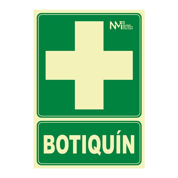 Fabricadas en PVC luminiscente. Grosor 0,7-1 mm según modelo, Clase A (1 mm) o. Clase B (0,7 mm). Distancia de visión 10 m. BOTIQUIN. Clase B. 224xh.300 mm.